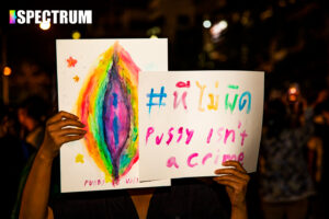 Pussy isn’t a Crime ศิลปะลดภาพมายาของจิ๋ม มีภาพอวัยวะเพศหญิงสีรุ้งโชว์ในม็อบศิลปะราษฎร ศิลปินบอก “คนๆ หนึ่งจะเลวก็ต้องเพราะนิสัยไม่ใช่ xี”
