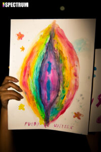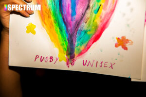 สุดท้ายเห็นที่รูปยังเขียนด้วยว่า “Pussy is Unisex” ด้วย อยากจะสื่ออะไร? – “Pussy is Unisex ก็คือตรงตามตัวเลยค่ะ เหมือนหลายๆ คนมองว่า pussy เป็นสัญลักษณ์ของเพศหญิง ซึ่งจริงๆ แล้วมันไม่จำเป็นเสมอไป อย่าง transmen ซึ่งเป็นผู้ชายก็อาจจะมีได้ หรือคนอื่นๆ ที่ไม่ได้นิยามตัวเองว่าเป็นผู้หญิงก็มีได้เหมือนกัน ไม่อยากให้ผูกติดกับความเป็นผู้หญิงอย่างเดียว เพราะฉะนั้นเราอยากให้คนโอบรับและทำความเข้าใจกับตรงนี้ด้วย”